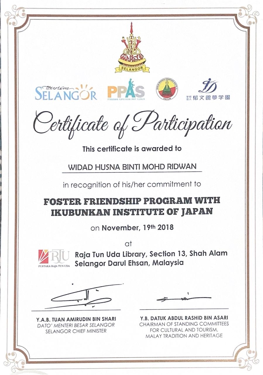 | 21 | Certificate Of Participation | Foster Friendship Program With Ikubunkuan Institute Of Japan | 2018 | View Full Size |