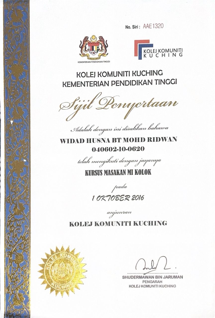 | 15 | Sijil Penyertaan | Kursus Masakan Mi Kolok di Kolej Komuniti Kuching | 2016 | View Full Size |