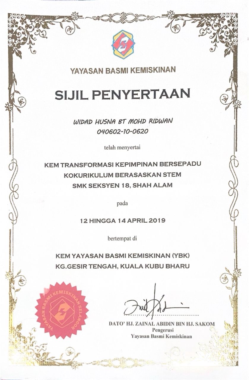 | 22 | Sijil Penyertaan | Kem Transformasi Kepimpinan Bersepadu Kokurikulum Berasaskan STEM Smk Seksyen 18, Shah Alam | 2019 | View Full Size |