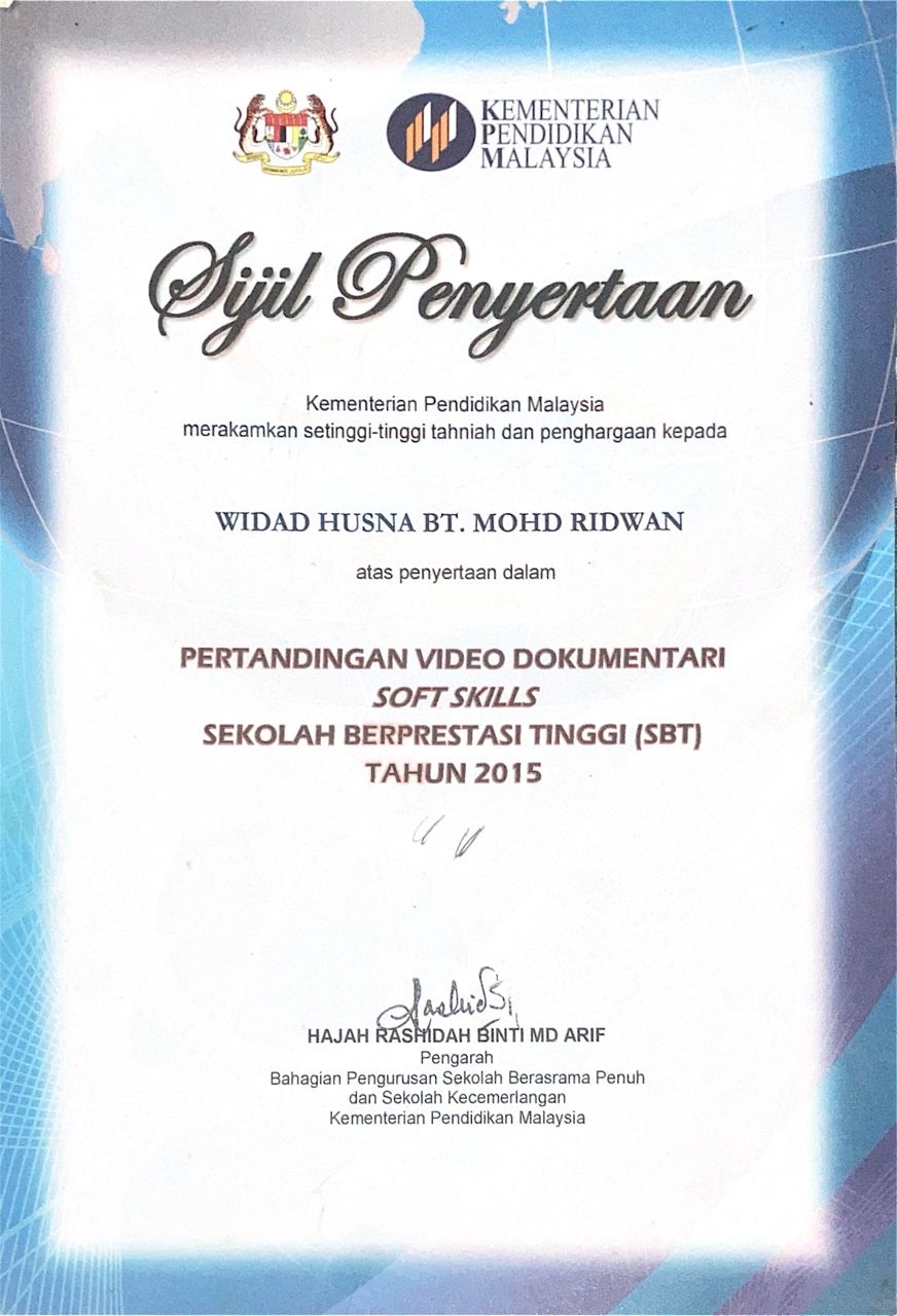 | 8 | Sijil Penyertaan | Pertandingan Video Dokumentari Soft Skills Sekolah Berprestij Tinggi (SBT) Tahun 2015 | 2015 | View Full Size |