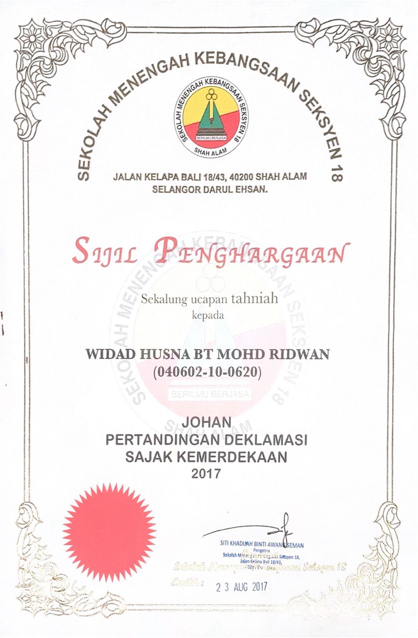 | 18 | Sijil Pencapaian: Johan | Pertandingan Deklamasi Sajak Kemerdekaan 2017 | 2017 | View Full Size |