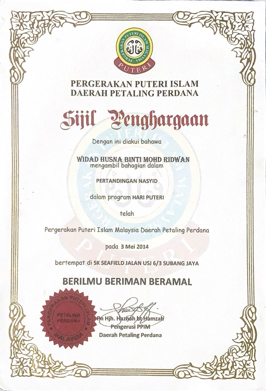 | 4 | Sijil Penghargaan | Pertandingan Nasyid Hari Puteri Islam Malaysia Peringkat Daerah Petaling Perdana | 2014 | View Full Size |