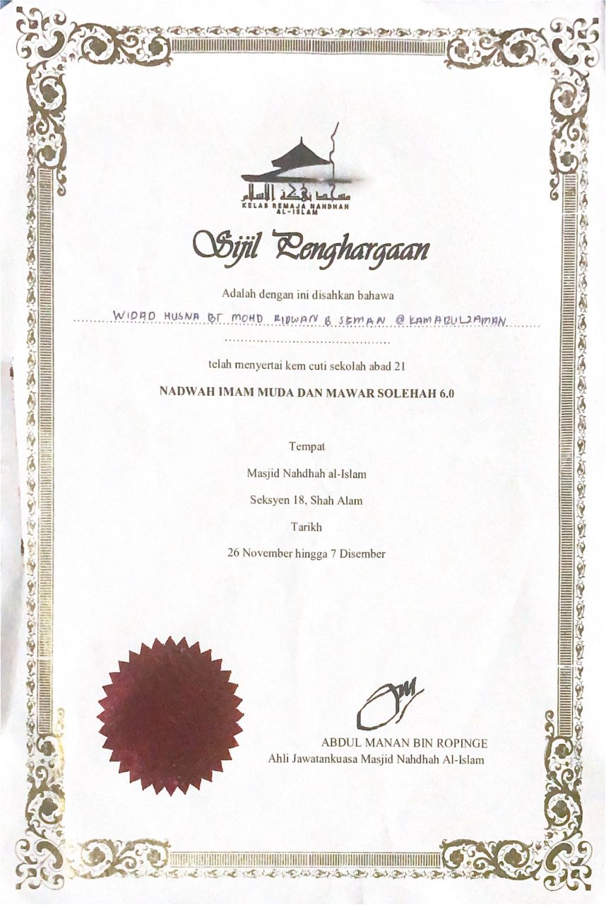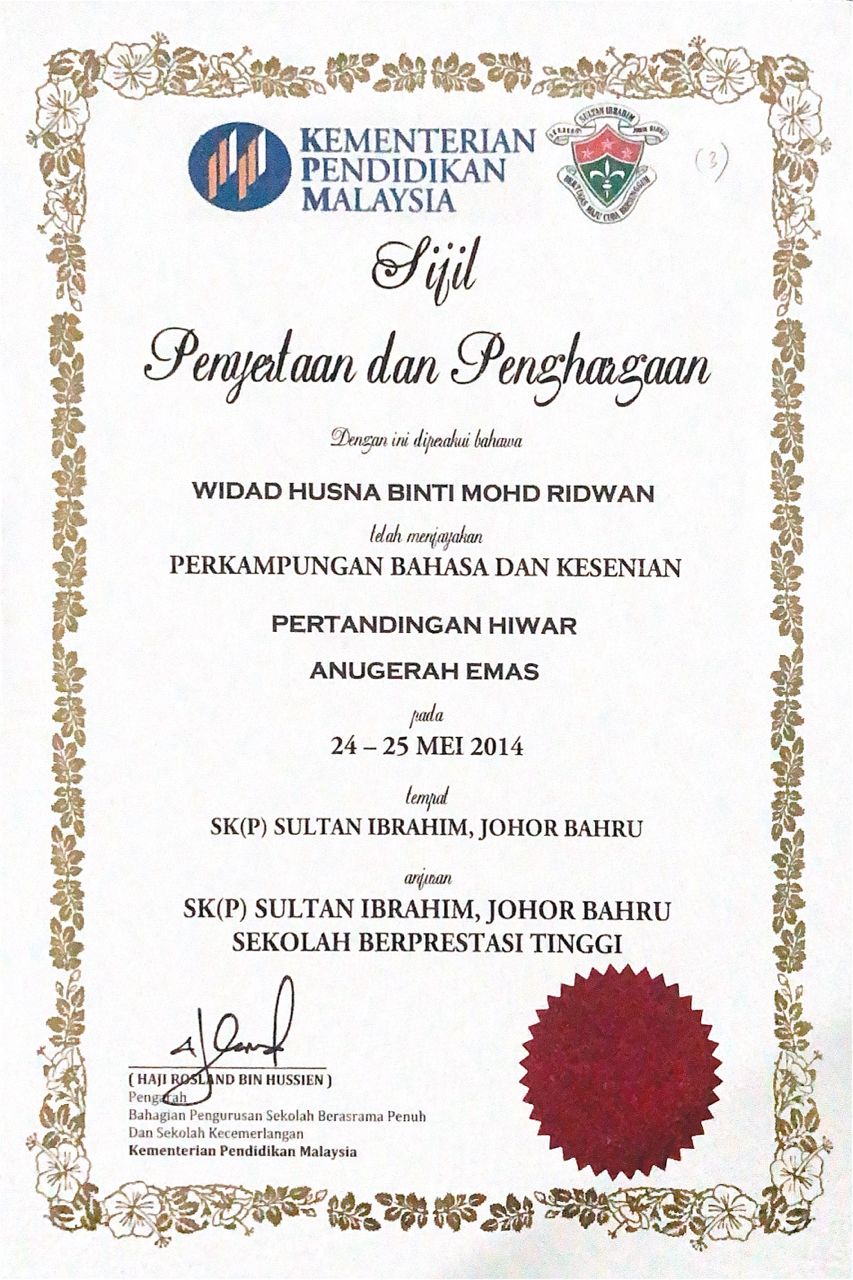 | No. | Certificate Title | Description | Year | View | 1 | Sijil Pencapaian: Anugerah Emas | Perkampungan Bahasa Dan Kesenian Pertandingan Hiwar | 2014 | View Full Size |