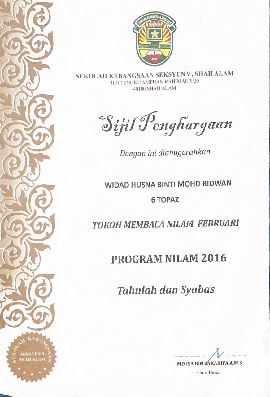 | 16 | Sijil Penghargaan | Tokoh Memabaca Nilam Februari Program Nilam 2016 | 2016 | View Full Size |