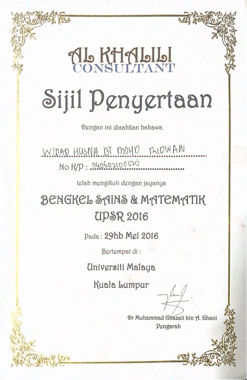 | 17 | Sijil Penyertaan | Bengkel Sains & Matematik UPSR 2016, Universiti Malaya Kuala Lumpur | 2016 | View Full Size |