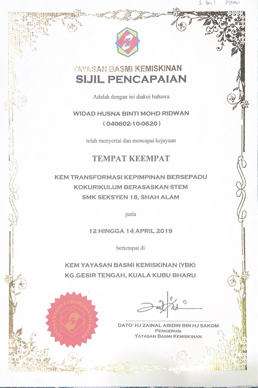 | 23 | Sijil Pencapaian: Tempat Keempat | Kem Transformasi Kepimpinan Bersepadu Kokurikulum Berasaskan STEM | 2019 | View Full Size |