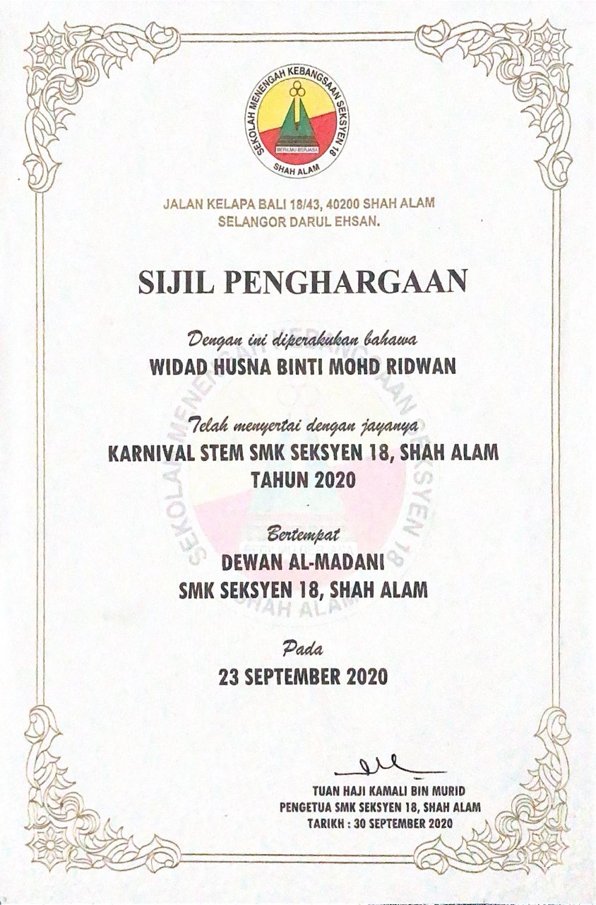 | 24 | Sijil Penghargaan | Karnival STEM Smk Seksyen 18, Shah Alam Tahun 2020 | 2020 | View Full Size |