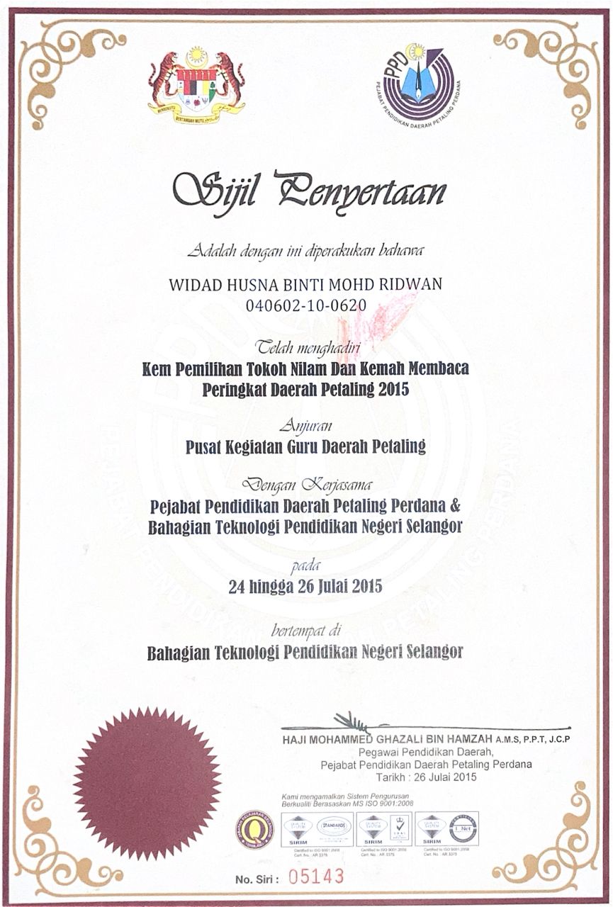 | 6 | Sijil Penghargaan: Tempat Keempat | Kem Pemilihan Tokoh Nilam Dan Kemah Membaca Peringkat Daerah Petaling 2015 | 2015 | View Full Size |