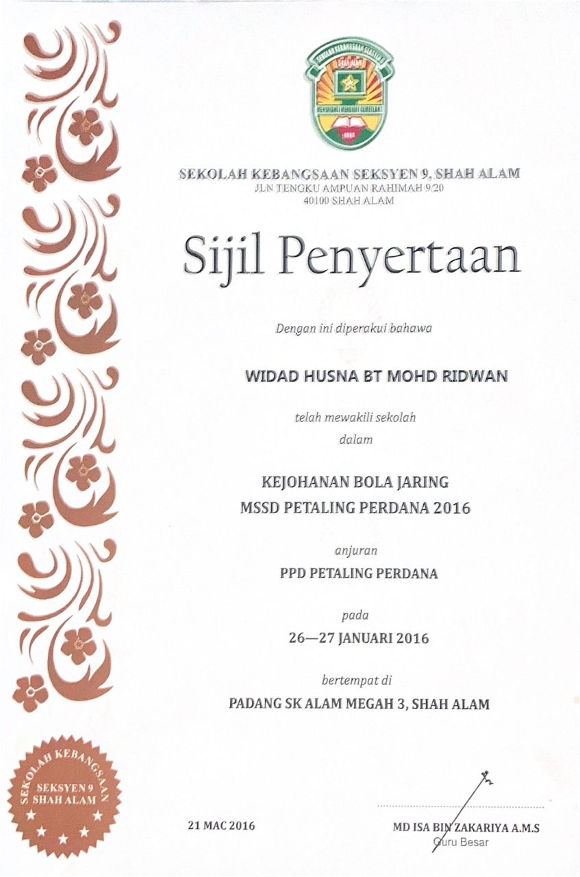 | 13 | Sijil Penyertaan | Kejohanan Bola Jaring MSSD Petaling Perdana 2016 | 2016 | View Full Size |
