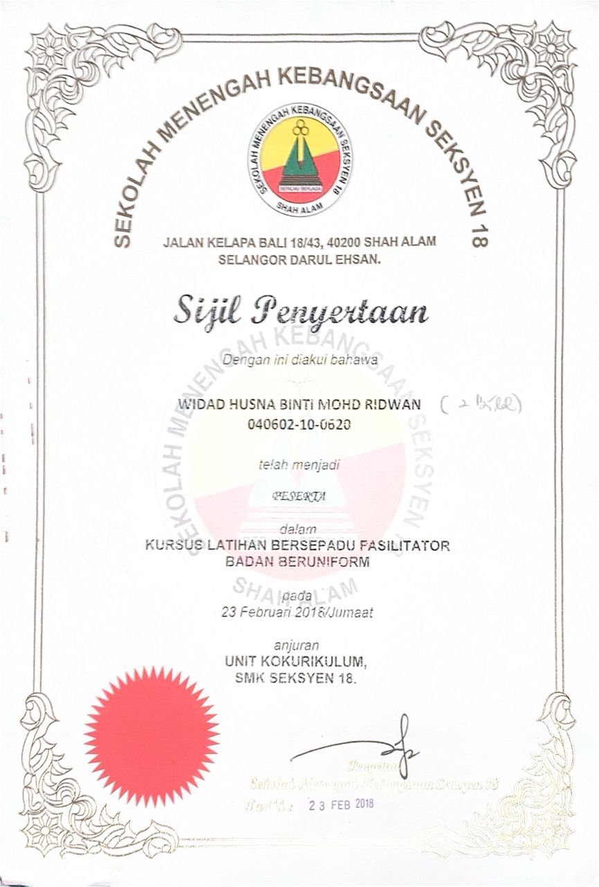 | 20 | Sijil Penyertaan | Kursus Latihan Bersepadu Fasilitator Badan Beruniform | 2018 | View Full Size |